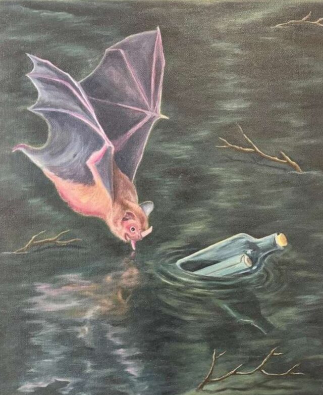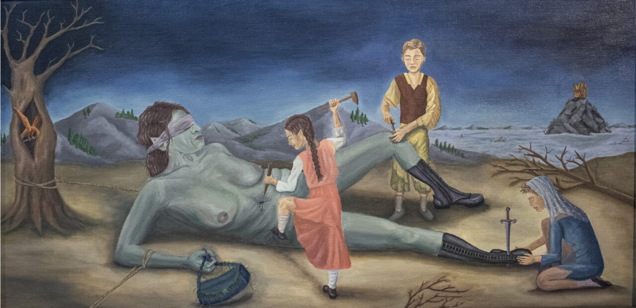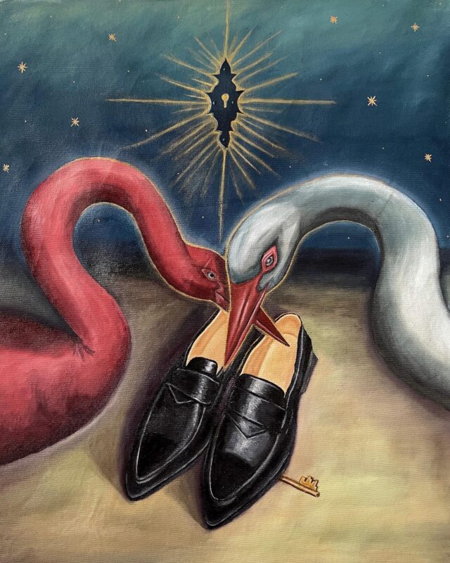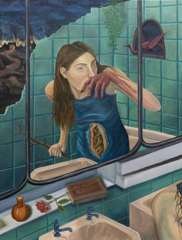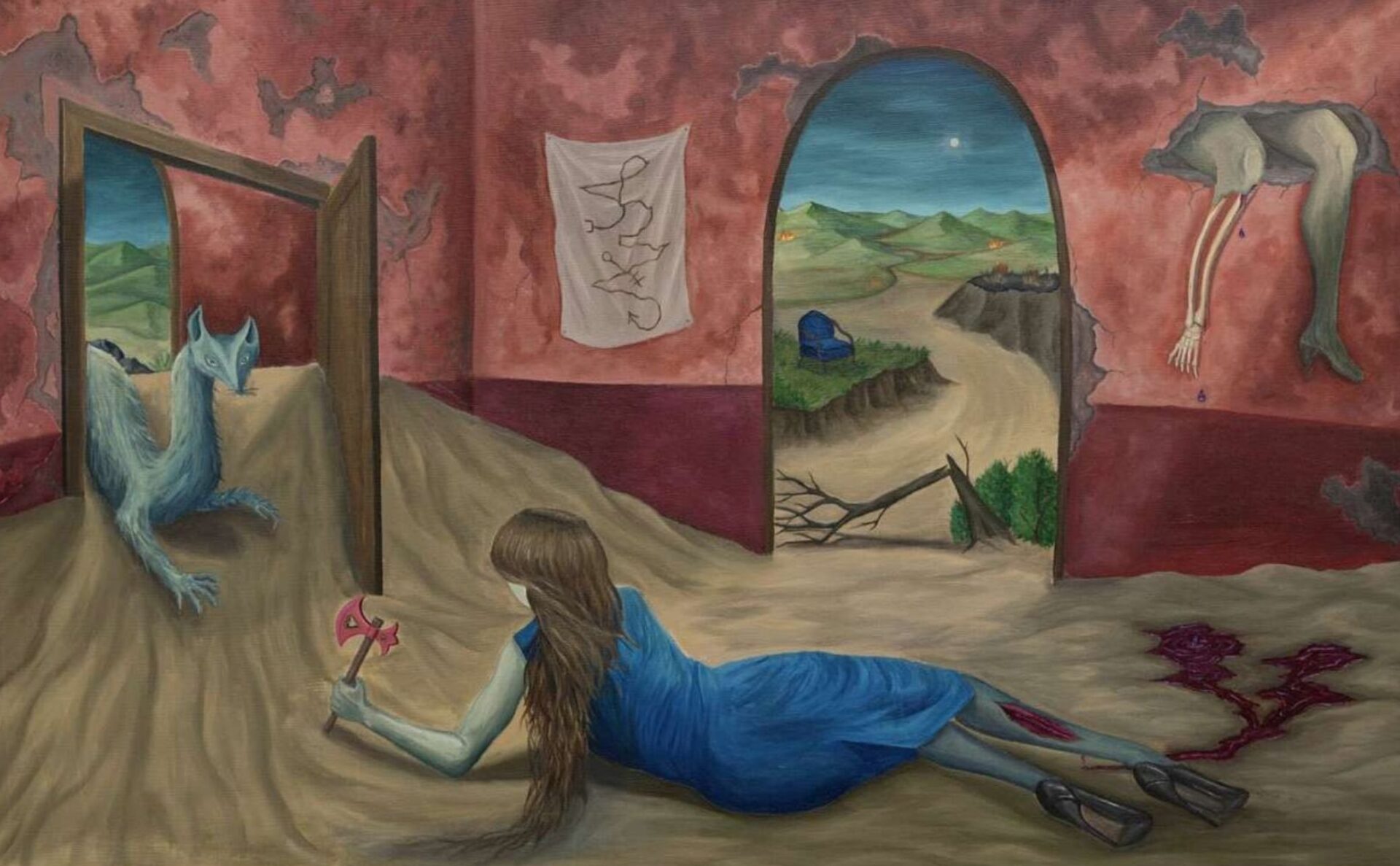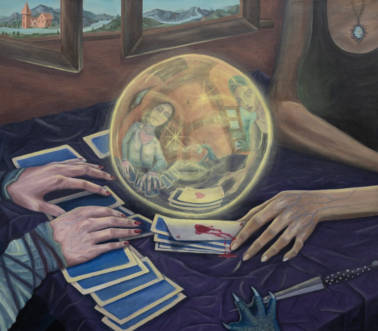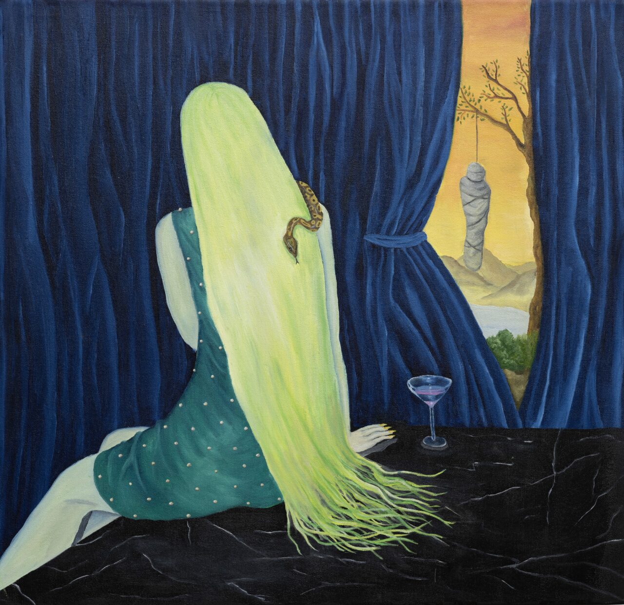 Las pinturas de Renata son imágenes visionarias, imágenes oníricas que podrían ser referencia de escenas de películas que no existen pero que ella visualizó en su cabeza. Así como su obra está nutrida por el realismo mágico de la literatura, su formación como directora de fotografía se manifiesta en la composición, en el uso de la luz, y el punto de vista de las imágenes. Su obra funciona a partir de una revisión de imágenes del pasado y dialoga con esos mitos esenciales que tienen tal poder arquetípico que constituyen eternos valores para la humanidad. Se nutre de los elementos de tradición religiosa, alquímica y esotérica que simbolizan la realidad espiritual que se esconde detrás del mundo visible. En su mitología personal, las mujeres encarnan personajes arquetípicos que se enfrentan a insignias heroicas de lucha o entrega total ante un sacrificio que tienen que hacer. Los escenarios liminales no pertenecen a ningún espacio o tiempo identificable, y siempre hay un elemento siniestro que nos aleja del mundo cotidiano. La naturaleza acompaña cada pintura simbolizando esa realidad espiritual que nos rodea y que aguarda nuestra comprensión. Las mujeres, como hechiceras, saben cómo acceder a ese poder y están dispuestas a sacrificarlo todo para alcanzar las leyes eternas y animar la vida profunda de la psique. En otras palabras, se puede sentir la intuición que detrás de la metáfora, hay algo más que una sustitución ornamental de la realidad.
