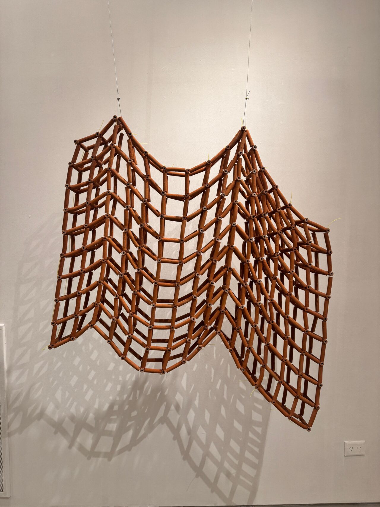Hand-extruded modeling in red Córdoba clay; low-temperature fired (1040°C) in an oxidizing atmosphere. Modules sewn with steel cable