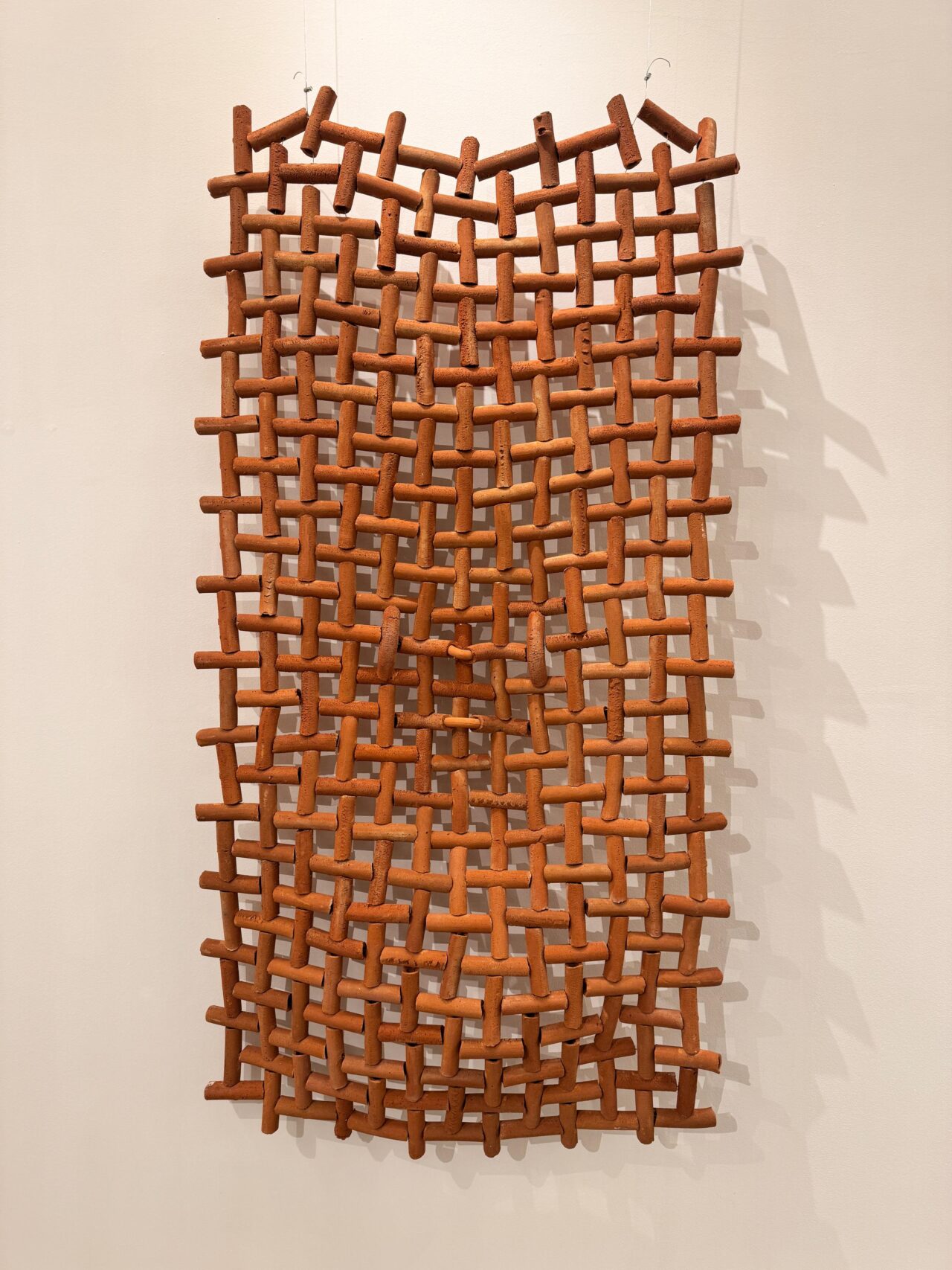 Here, ceramics are modules, synecdoche. The weaving is construction, praxis. In these structures composed of clay links, the same material usually used for making bricks, weaving and ceramics manifest themselves naked and in unity. Form and matter distance themselves from their common use but do not stray far.