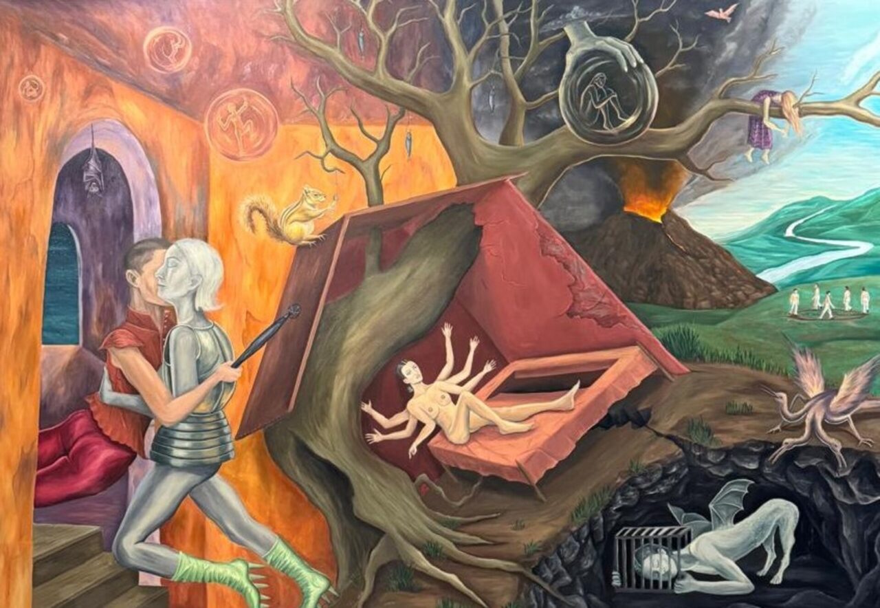 Pero en la imaginería de Renata no solo encontramos formas propias de una iconografía fantástica —figuras antropomorfas, volcanes en erupción, cuerpos arrojados, la luna, el agua, un rayo, una casa cortada al medio— sino también los ecos de las voces femeninas del surrealismo latinoamericano del siglo XX. De artistas en el exilio que, como Leonora Carrington, apelaron a sus propias historias —de lucha, de voracidad artística, de filiación comunal en un contexto de vanguardia— para generar una ficcionalidad capaz de conjurar los desastres de las guerras pasadas, presentes y futuras.