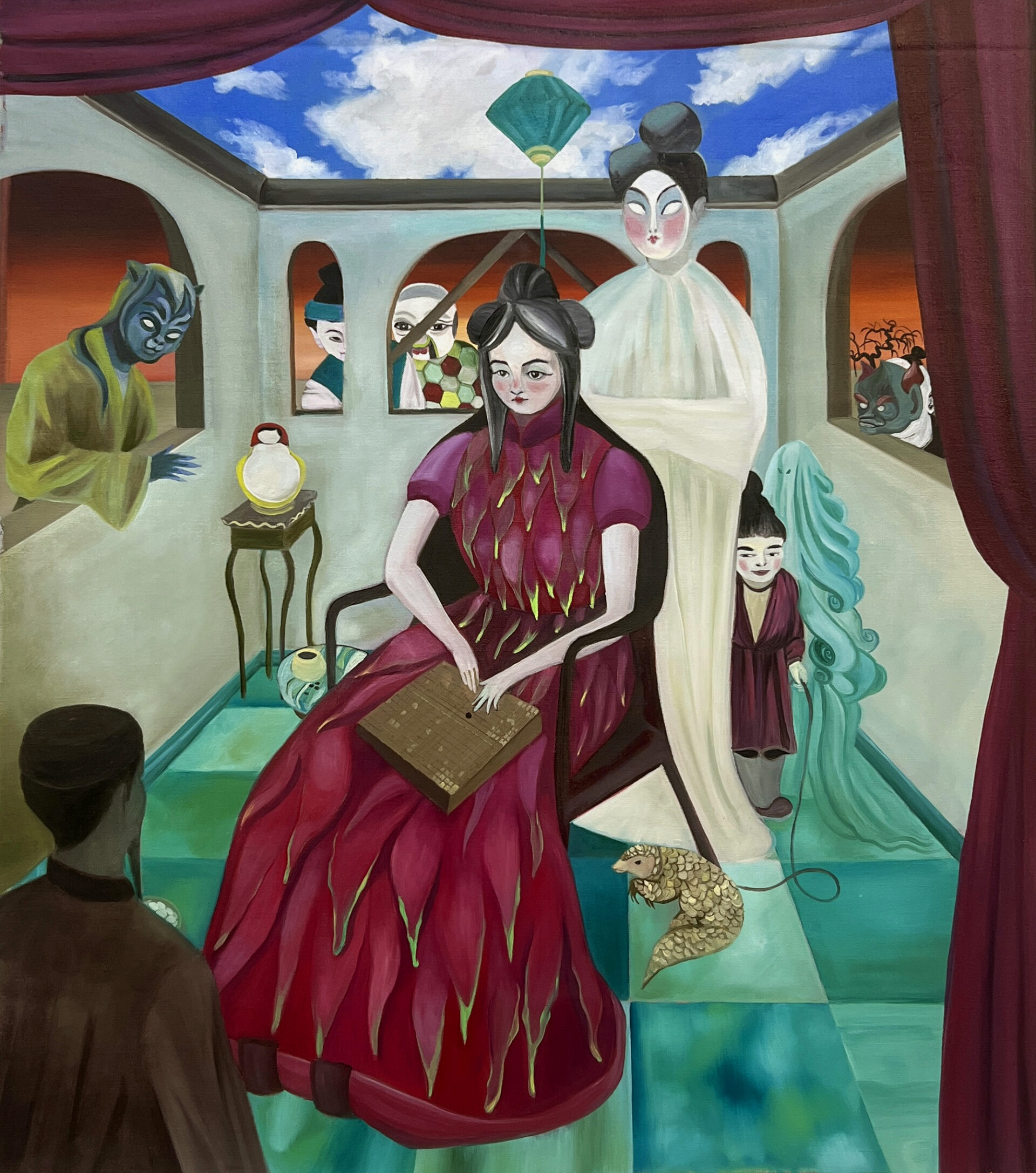 At the beginning of this year she did an artist residency in Beijing. Influences from her surroundings have begun to creep into her new paintings. The style of the traditional hairstyles of the Chinese dynasties, the Shan Shui landscape, ornamental motifs such as the Pan Chang (auspicious knot) and the fanciful characters of the Dongyué Temple (an old Taoist temple built several times whose sculptures were destroyed during the Cultural Revolution and then inventively replicated).