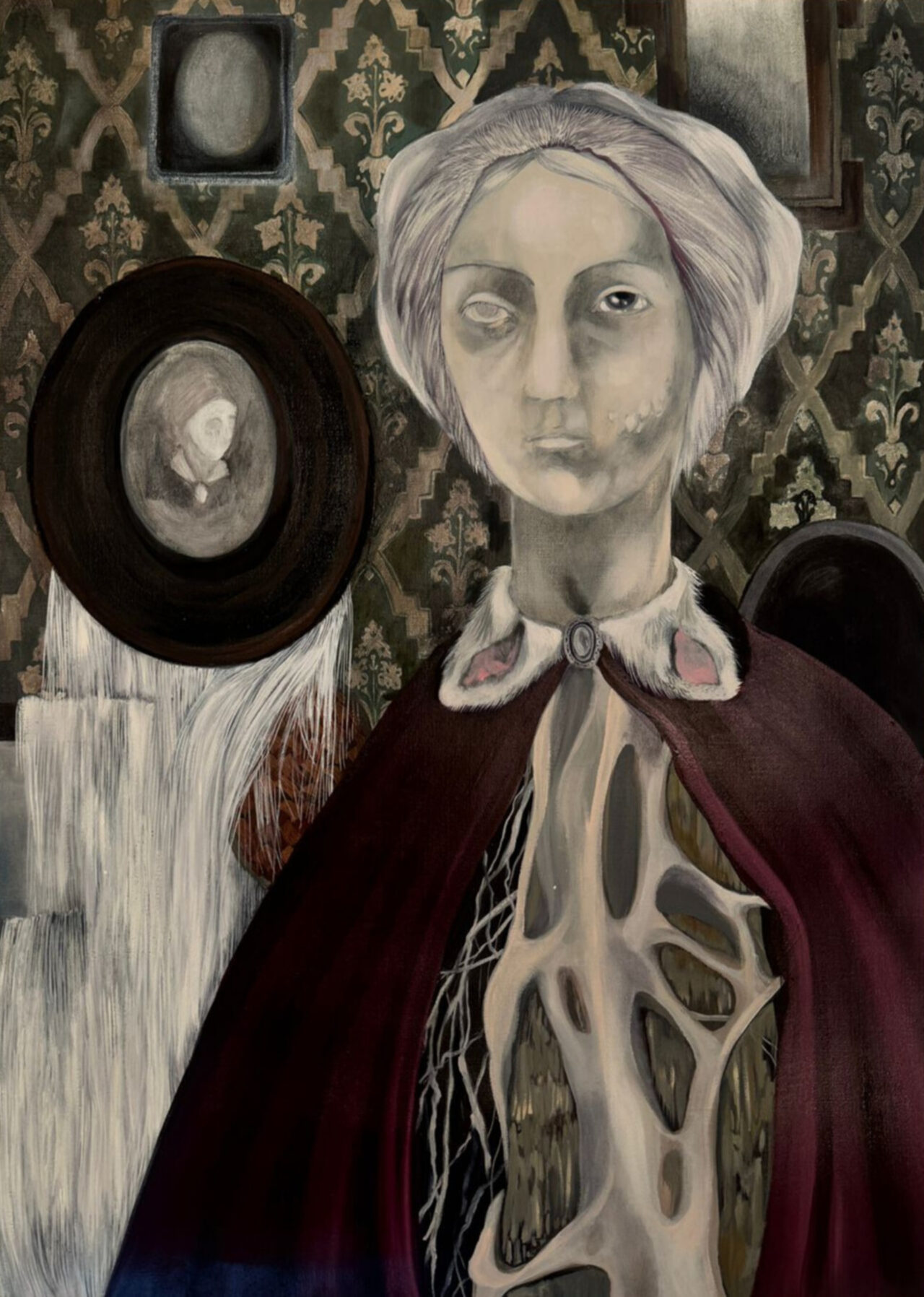 Verónica Gómez conceives her artworks as an imaginary book unfolded in space. She is interested in moving the viewer through humour, drama and tenderness. Gothic horror and the stylistic preferences of the Argentinean middle class born in the middle of the 20th century come together in her artwork as an emotional manifesto of social belonging. A series of girls and women wearing strange costumes and placed in highly ornamented environments make up in his paintings a kind of dysfunctional and kindly family.