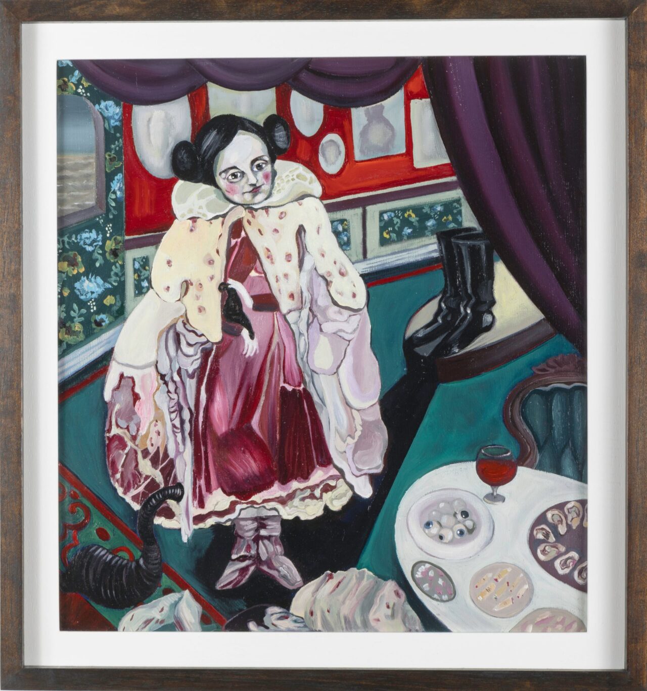 5. A lo largo del siglo XX, la relación entre la facultad de narrar y la elaboración de traumas colectivos –como el advenimiento de las derechas– prestó la ocasión para distintas disquisiciones teóricas. En los cuadros de aparato que muestran escenas complejas la vena narrativa de Gómez aparece como la exhumación de tiempos dispares en la historia de la pintura. La olvidada capacidad que se había atribuido a esta última para contar historias, codificada por el siglo XV, es uno de esos momentos. Sedimento y hojaldre de una temporalidad compuesta, están en el cúmulo de los cuadros las referencias puntuales a personajes de la más rabiosa actualidad, pero también la enseñanza que la pintura de entreguerras dejó en el siglo pasado para procesar la zozobra, los códigos del retrato monárquico o el recuerdo de la literatura infantil ilustrada, iluminado por los fulgores de la tradición surrealista. Las criaturas femeninas pintadas por la artista en series previas retornan: es el cuerpo feminizado al que se ha atribuido en grado eminente la capacidad de encarnar alegorías en el arte occidental. Sucede como si lo anacrónico fuera una estrategia subjetiva para abordar la inminencia de una pesadilla.