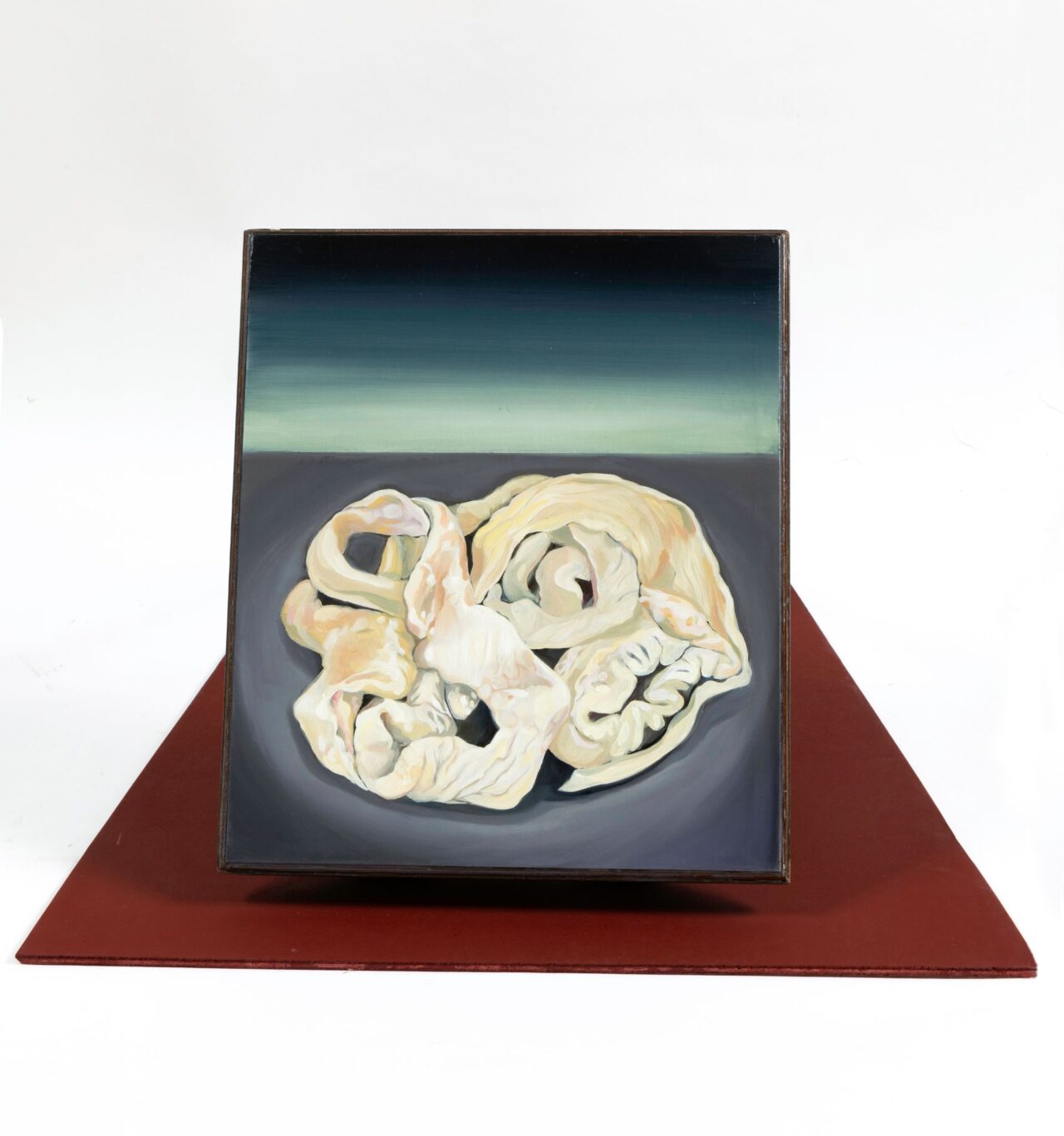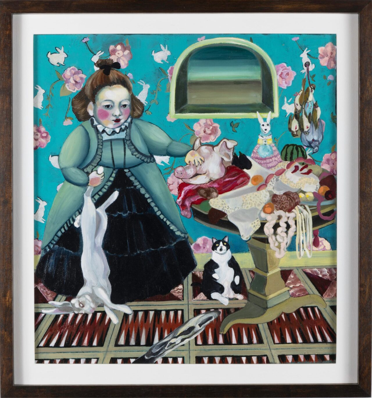 3. Como corresponde al ideal barroco del saber, los cuadros alegóricos de esta exposición cumplen una función de almacenamiento: son el asilo de ideas que han llegado desde otra parte. Nacidas de la tormenta que significa el avance de las derechas radicales en el mundo pero en especial en este país, son el precipitado de rumiaciones, sentimientos negativos y escenas de un cuerpo social desamparado y expuesto a las políticas de crueldad. La forma encriptada en la que aparece este sustrato experiencial remite a distintos códigos culturales y a disímiles dominios del saber: la historia social de la carne, la fabulística que liga a la vida animal con la moralidad, la noticia política, los imaginarios de contubernios e intrigas en la tradición satírica, y en general, la vasta herencia de la iconografía artística occidental. La artista no declama su erudición –sabe que la pintura es un arte mudo– pero no hace maniobras distractivas para esconder el tesoro que la prodigalidad de un temple curioso ha recogido con décadas de trabajo sostenido.