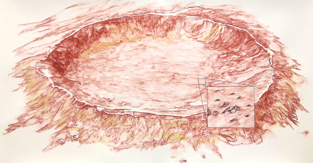 Las acuarelas que construyen los paisajes de César Núñez, se ofrecen como un espacio otro, estéril, rocoso y deshabitado. Un territorio sin interrupciones aún, sin ningún rastro que nos permita descubrir el origen y la temporalidad de los mismos. César encuentra la metáfora de estos mundos en la ciencia, al explicar, que el límite que existe entre el espacio y los agujeros negros, aloja posibles territorios que no pudieron alcanzar la velocidad de la luz. Usar el arte como lenguaje (herramienta de creación) para explicar fenómenos del cosmos (ciencia) se torna tan atrapante como incómodo.