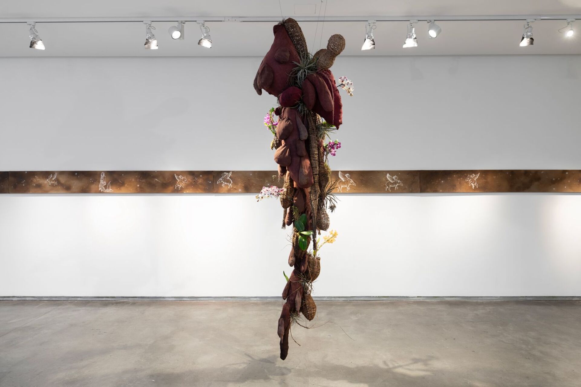 La muestra abre con un suspenso literal: esculturas colgantes de raíces monumentales, suspendidas en el aire como si esperaran todavía encontrar un suelo donde anclarse. No hay aquí metáfora tímida: son raíces de gran escala, cuerpos fibrosos que cargan semillas ocultas, tesoros en pausa que aguardan su momento de germinación.